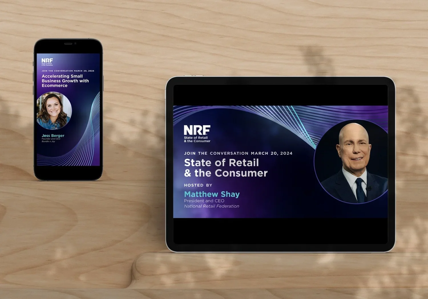 The National Retail Federation hosts the State of Retail & the Consumer as a digital event, which you can view above. I led the design for this event with feedback from the team. Using NRF’s consumer color, purple, and the idea of connection, I designed the event backgrounds, the social graphics, as well as chart with the accompanying data. With such a specific style of event, I was challenged to find a design that could cross angled walls as well as many different size collateral.